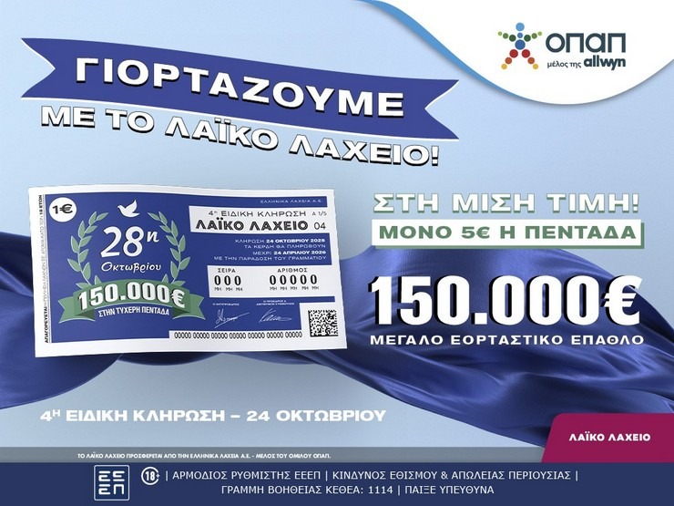 Η 4η ειδική κλήρωση του Λαϊκού Λαχείου για το 2025, θα μεταδοθεί ζωντανά την Παρασκευή 24 Οκτωβρίου στις 19:00, από το κανάλι του ΟΠΑΠ στο YouTube. Εκτός από το μεγάλο έπαθλο των 150.000 ευρώ στην τυχερή πεντάδα, η ειδική κλήρωση για την εθνική επέτειο της 28ης Οκτωβρίου, μοιράζει στους παίκτες και άλλα, μικρότερα έπαθλα.