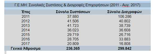 Αναφορικά με τα κατά καιρούς δημοσιεύματα στον ημερήσιο τύπο τα οποία αναφέρονται σε αριθμούς «λουκέτων» με «επιλεκτικά» στοιχεία από το Γενικό Εμπορικό Μητρώο, η Γενική Γραμματεία Εμπορίου και Προστασίας Καταναλωτή παραθέτει σε μορφή πίνακα το σύνολο των συστάσεων και διαγραφών επιχειρήσεων στο σύνολο της χώρας που αφορούν το χρονικό διάστημα από Ιανουάριο 2011 έως τον Αύγουστο του 2017.