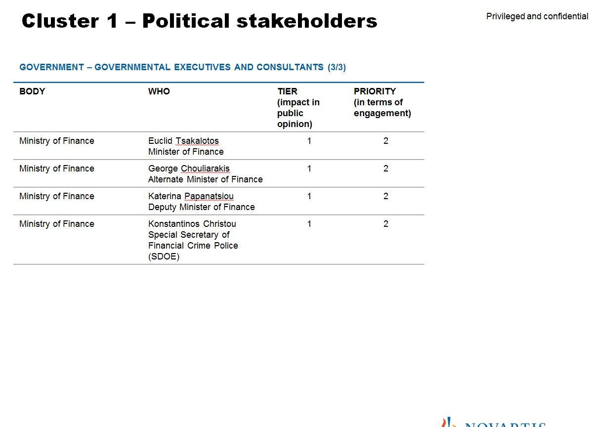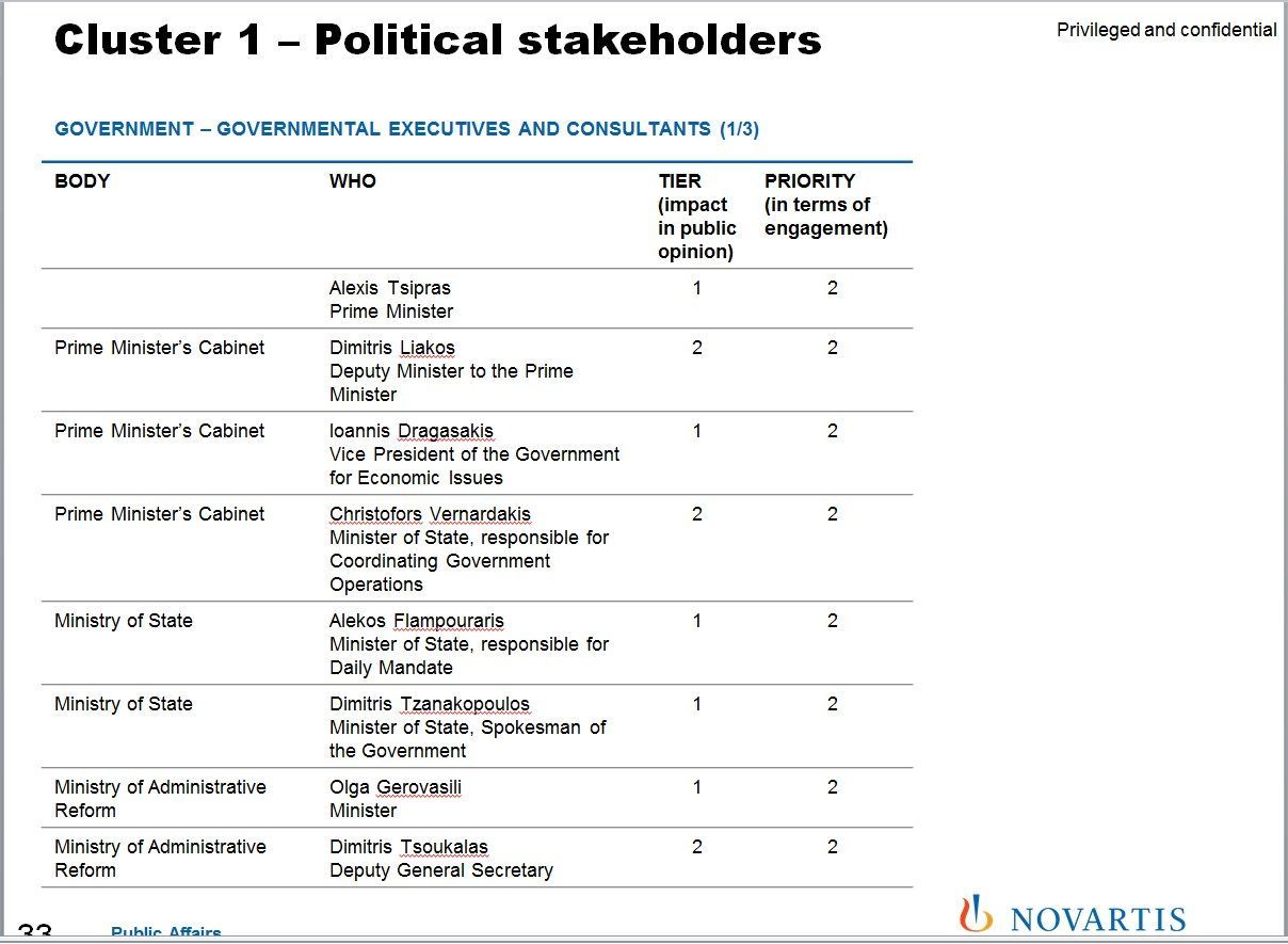 Στην έκθεση καταδεικνύεται πως η φαρμοκοβιομηχανία αμέσως μετά το ξέσπασμα του σκανδάλου προβαίνει σε χαρτογράφηση του πολιτικού προσωπικού σε κομβικά υπουργεία (Υγείας, Οικονομικών, Δικαιοσύνης) όπως επίσης λοιπών κυβερνητικών στελεχών πέριξ του πρωθυπουργού, προέδρους κομμάτων και φορείς που σχετίζονται με το χώρο του φαρμάκου για να εντοπίσει και τους πιθανούς φίλους από τους εχθρούς.