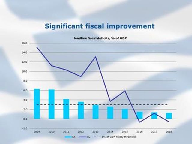 Η Ελλάδα σημείωσε σημαντική πρόοδο όσον αφορά την επιστροφή της σε τροχιά δημοσιονομικής βιωσιμότητας. Το ισοζύγιο της γενικής κυβέρνησης βελτιώθηκε από έλλειμμα 15,1% το 2009 σε πλεόνασμα 0,7% το 2016. Το ποσοστό αυτό είναι πολύ χαμηλότερο του ορίου του 3% που ορίζει η Συνθήκη για τη λειτουργία της Ευρωπαϊκής Ένωσης. Η θετική αυτή εξέλιξη έρχεται να προστεθεί στις σημαντικές και εκτεταμένες μεταρρυθμίσεις που ενέκρινε η Ελλάδα στο πλαίσιο των δεσμεύσεών της βάσει του προγράμματος στήριξης της σταθερότητας του ΕΜΣ.