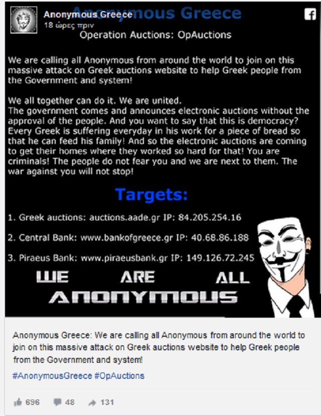 «Καλούμε τους Anonymous από όλον τον κόσμο να ακολουθήσουν αυτήν τη μαζική επίθεση στην ιστοσελίδα των ελληνικών πλειστηριασμών για να βοηθήσουμε τους Έλληνες πολίτες από την κυβέρνηση και το σύστημα.
