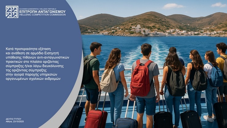 Την Τετάρτη 22 Οκτωβρίου 2025, η Επιτροπή Ανταγωνισμού προχώρησε στην κατά προτεραιότητα εξέταση και ανάθεση σε αρμόδιο Εισηγητή της αυτεπάγγελτης έρευνας στην αγορά παροχής υπηρεσιών οργανωμένων εκπαιδευτικών εκδρομών/ επισκέψεων/ ταξιδίων σε σχολεία, κατ' εφαρμογή του άρθρου 15 ν. 3959/2011.