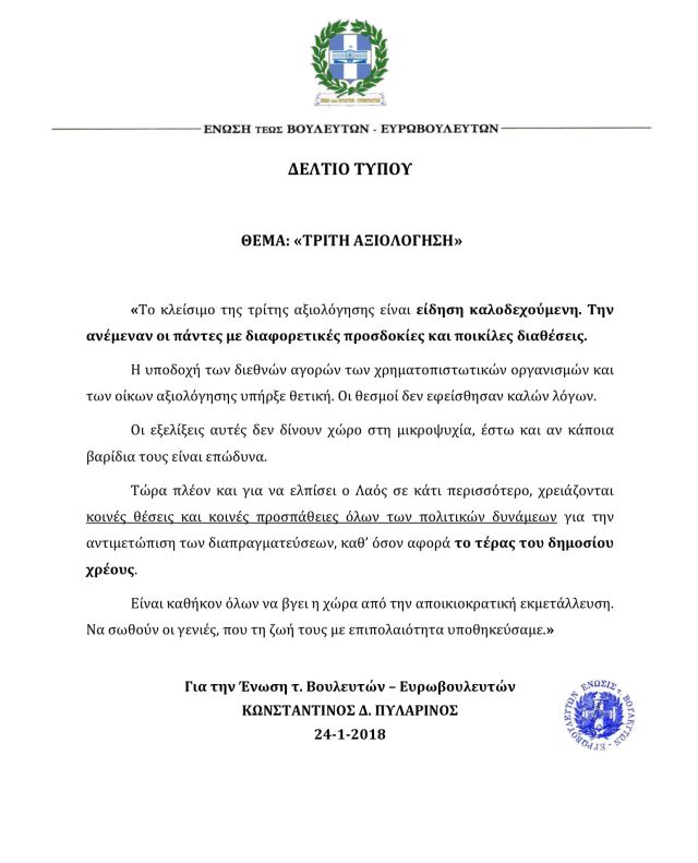 «Το κλείσιμο της τρίτης αξιολόγησης είναι είδηση καλοδεχούμενη, την ανέμεναν οι πάντες», αναφέρουν και προσθέτουν πως «οι εξελίξεις αυτές δεν δίνουν χώρο στην μικροψυχία έστω κι αν κάποια βαρίδια τους είναι επώδυνα».