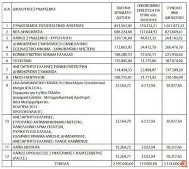 Αναλυτικότερα, η γ΄ δόση του 2017 της κρατικής οικονομικής ενίσχυσης ανά κόμμα έχει ως εξής: