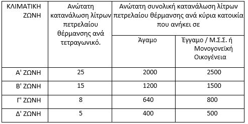 3. Για κάθε κατοικία, ανεξαρτήτως ζώνης, χορηγείται επίδομα σε άγαμους για τα πρώτα 80 τετραγωνικά μέτρα και για τα πρώτα 100 μέτρα για τους έγγαμους και τις μονογονεϊκές οικογένειες, με ανώτατη κατανάλωση πετρελαίου θέρμανσης ανά κλιματική ζώνη και ανά τετραγωνικό ως ακολούθως: