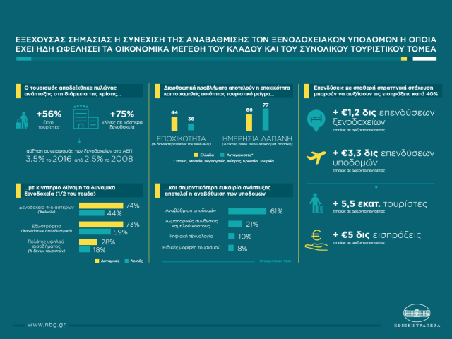 Σε σταθερό πυλώνα ανάπτυξης αναδείχτηκαν τα ξενοδοχεία κατά τη διάρκεια της κρίσης, ανεβάζοντας τη συνεισφορά τους στο ελληνικό ΑΕΠ σe 3,5% το 2016 (από 2,5% το 2008), έναντι μέσου όρου 1,6% στις βασικές ανταγωνίστριες μεσογειακές χώρες.